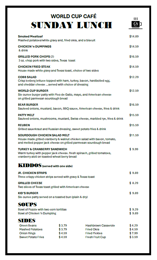 WORLD CUP CAFE & WORLD CUP FAIR TRADE MARKET WORLD CUP CAFE FAIR TRADE MARKET ONLINE ORDERING Shop Now Events Register today for upcoming Fair Trade WorkshopsCLICK ON WORKSHOPS FLYER TO REGISTER SPECIAL MENUS - Click to see full